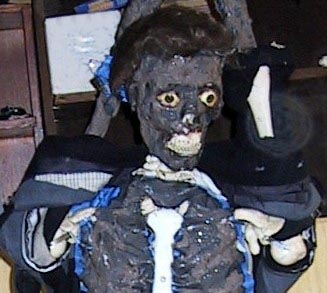 I also spent a lot of time tramping this clothing into a box of soot gathered from my chimney. This produced a dirty effect, which, as a bonus, got all over the skeleton because it was so caked in that it drifted off while I was working on her. It really added a nice look to the bones - (I just hope it comes off as easily as it went on).