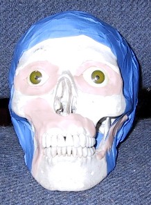 You may also notice that the skull is now more completely taped so that I can apply the liquid latex and paint onto it without permanently altering the skeleton. Every area where you see blue tape is either going to be covered in liquid latex and paint or it being protected from the covering process.