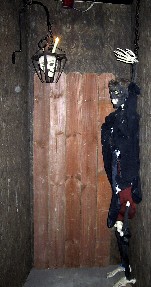 The prisoner is hung in front of a door to give the patrons something to worry about. Whenever there is a door, there is a potential for something to pop out of that door and get them. In fact, the door does not open - if it did, my skeleton would go flying. It's not really very good prison placement on behalf of the pirates when you think about it.