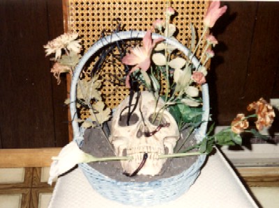 So I thought a nice simple skull with a huge whacking hole in the back of it would be more realistic. To have it buried in the earth in a basket with flowers thoughtfully planted around it (not to mention in it) would complete the effect. It was an easy one to make. The earth was made of liquid latex (my first adventure in this direction as I recall.) The most complex part for me was finding flowers I thought would look 'appropriate'. I wanted muted colors in oranges, reds, blacks and similar dark colors. Naturally I wanted a lily in the teeth as the pièce de résistance. One of the best things I found were the dead-looking black twig things. (I must confess, I do wonder what floral arrangers use such things for.)