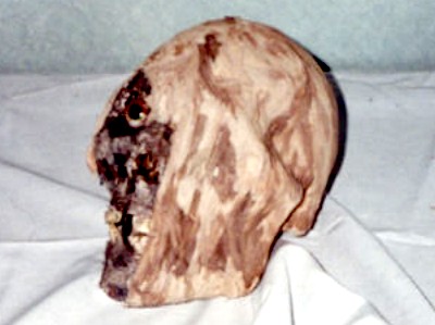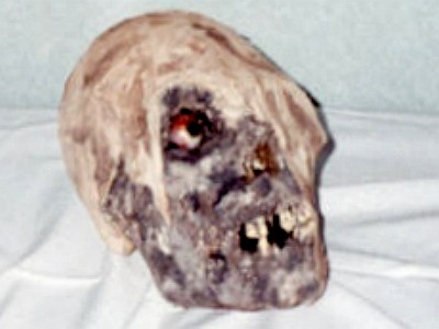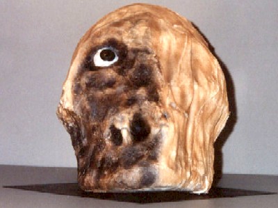 Creeops was one of the HEDZ designed for a Haunted House room built in the 1994 Wyandotte, Michigan Jaycess Haunted house. Unfortunately no photos were taken of that room - to my everlasting chagrin. (I liked the room.) It was designed like a 15' or so long corridor in a museum with 6 pedestals, 3 on each side. A large, half-body prop was featured at the end of the room on a special platform. Spot lights shown on each head. There were also humorous descriptions of each head. Of course, those have been lost as well. Ah, well. The scare was that one of the pedestals was hinged so someone could hide behind it. They were wearing a mask I had designed to look like the HEDZ.