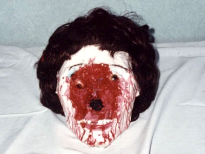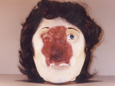 Defaced was originally designed for the museum room in in the 1993 Wyandotte, Michigan Jaycees Haunted house where the heads were the primary focus. As I have mentioned on other HEDZ pages, this room featured a museum-like setting with six side pedestals and a platform at the end with a half-body prop. Each of the six pedestals contained a different and a nameplate. One of them was hinged so that a person in a HEDZ-like mask could hide behind it and jumpt out. I decided to make this prop female because I had made all the rest of them male. (Well...when you could tell what sex they were, that is). This prop was originally named Shotgun Sally, but I later decided I didn't like the use of an actual person's name and changed it to more depersonalized 'Defaced.'