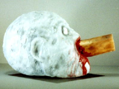 Since I had a pipe in mind when I created this particular prop, I used a piece of fence post when I created the initial piece. When I actually started considering the production cost of this particular HEDZ, I found out just how much round wood poles were! They were quite a bit more expensive than 2x4's. Not really needing the intruding object to be round for any particular reason, Shut Up! was re-sculpted using a 2x4 by the time he arrived at the 1996 Halloween Show in Chicago. Unfortunately for the flyer, which was done in advance of the pricing, the photos all showed the round wood post.