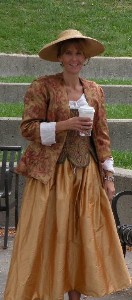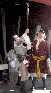 Below: some pictures of folks that I just sort of liked. Left: Lady Constance with her new chapeau drinking coffee in the park. Center, Sam and Red John Roberts up on the dock. Red John is looking more naval than pirate this day - maybe he's in disguise. Right: Michael with Mark Gist's boat the Firefly.