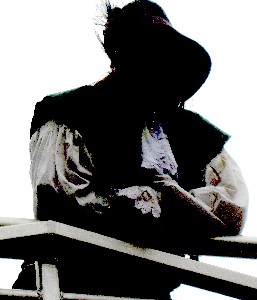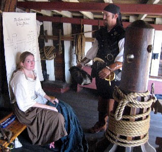Below left: Kate (trying awfully hard to look innocent) and Shannon on the rear main deck. What where they doing there? Only the capstan knows for sure - and he...she...it...whatever is not talking. Below right: Silas Thatcher with his gun cleaning kit. I was really impressed with this. (Turns out it came from Wal~Mart.)