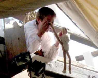 Below left: Miles dangles Lob over the edge of main deck. (Miles had some weird fascination with torturing Lob that I'm not sure can be explained without professional help.) Center: Trish and Michael contemplate the dilemma. Right: Trish has the solution - use the linstock to poke at Miles. (I'm not sure how this helped, but they did clean out some persistent spider webs.)