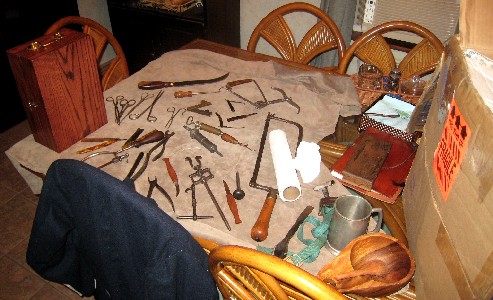My surgical gear and leather display piece were still wet, though. So I broke everything out of the box and wiped the raw steel instruments down again with paper towels to remove as much of the wet as possible. (There was a little rust, but that just gives the stuff character.) At left: my dining room table post-event.