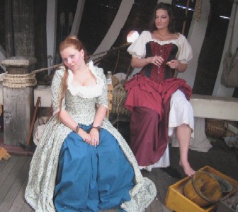 There were several other living history sorts of things going on. The nice thing about doing living history is that you don't have to explain anything unless you're asked and you can even get away with fooling around while you're doing it. For example, Sam and Shay played cribbage on the main deck during the morning tours (below left). Callenish Gunner took to the writing table set up on the Quarterdeck where he paid all his bills (below center). Hamish decided to show people how to most effectively irritate their parents by running up and down the gang-plank repeatedly (below right). Yes, living history is definitely the way to go.