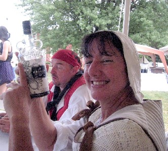 Goodies and information in hand (or head), we decided to leave the happy little burg of Havre de Grace and find out what the pirates had gotten into back at the Lockhouse. It proved to be a sort of rum drink - consisting of good rum, some sugar cubes and a squeeze of lemon. There had apparently been much imbibing afoot on the porch, as we heard them tittering like southern belles sipping mint juleps on the verandah as we approached. It was getting to the point where people were saying silly things. (Well, sillier things than normal re-enactors say.) I've noticed that when people have drunk enough alcohol to start saying such silly things, the only way to make those things make any sense is to catch up with them. Thus, with great pride, I brandished my new mug, ignoring the loose bits of whatever in the bottom (the alcohol will kill such if it's alive) and christened my fish-handled mug (below).