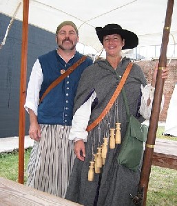 A lot of threats and shouting by the pirates followed. They brandished their weapons and... unfortunately, the previous weather rained on their parade (literally) causing the black powder to fizzle. (Below left.) As Shay explained it in her letter, "Never have I heard (or not heard) so many misfires. But the unflappable prates merely shout[ed] more threats and fire[d] again. Or attempt[ed] to." A few adjustments and *Bang* the pirates managed to make their point (below center.) The defenders then returned fire causing nobody to fall down. (I later learned that this was because they were worried that the grass was wet. You don't want to die and get your period clothes wet, after all.)