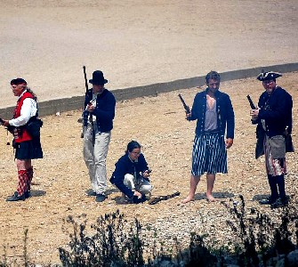 At right, Stephen Priddy and Nathan come running from the Princess in a dramatic moment - preparing to attack. The pirates took up offensively defensive positions on the beach. Below left are girl I don't know, Chris and Suzanne Larner at the ready. Below right we find Jay Henderson, Suzanne (still behind the sign) and guy and girl I don't know.