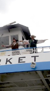 Below left: Although we Mercury crew members may not have a ship, we have our T-Shirts, thanks to QM William Brand. (I'd tell you how to get one, but I'm not entirely sure.) Below center: You have to give Sam this: he never quits trying. Below right: M.A. d'Dogge and Shannon in a truly absurd Titanic moment. They're kings of the world... on the top deck of a ferry. Uh-huh. (What is is about this pose? Titanic had nothing to do with piracy.)