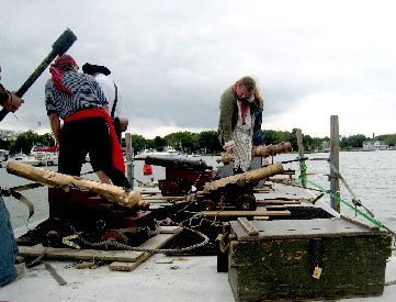 One of the cannon was cast aluminum with a two steel shafts fitted inside the barrel to give it strength for firing. It was painted black to look like a normal cast iron cannon as you can see at right. While aluminum is not a period-correct metal, it does make it a lot easier to move the cannons around. (This is particularly important when trying to get one of those beasts off a little floating barge onto land up a wooden ramp as I later learned.) Someone asked Bob if that didn't make the cannon too weak to fire. "We tested for that," he explained. "We decided to try to blow the barrel up by completely filling the thing with charges." I am guessing we are talking about 6 or 8 charges in that little cannon. "Then we blocked traffic on the nearby roads and we fired it. People heard it from 5 miles away!" See what I mean about wanting to startle as many people as humanly possible with the noise?