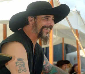 And that's just a sampling of the folks I met. I could write an entire page about William Red Wake, our benevolent leader When he arrived, he had been up for 41 hours straight working on details. He has these magnificent drawings of the Mercury ship that we are supposed to be careening which he drew in Freehand. (!) After telling us how long he'd been up, he stayed about several more hours working on the huge canvas flag I mentioned . He is quite the artist. A better contact person to represent the Mercury careening camp at the pyracy.com pub I don't think you could find.