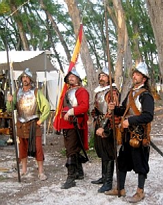 I imagine that the conquistador plot was hatched in Willie Wobble's community food prep and dining space or neighboring William and Doug's campsite as they make up the bulk of the force. Somehow they got Bone Island Buccaneer Deadeye to turn coat on his captain and join their cause (probably because he had a breast plate). The conquistadors appear at right - from left, Willie Wobble, William the mysterious pirate from the mysterious crew, Deadeye and Doug, who appears to be William's dogs body and whipping boy.
