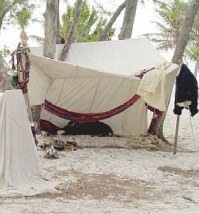 M.A. d'Dogge's encampment. At left: The sloping, sloppy, hammock-hanging