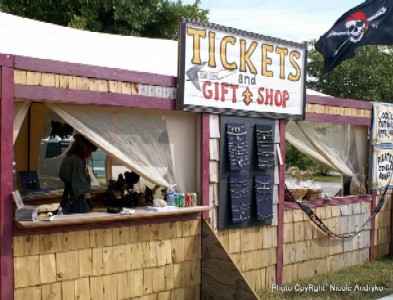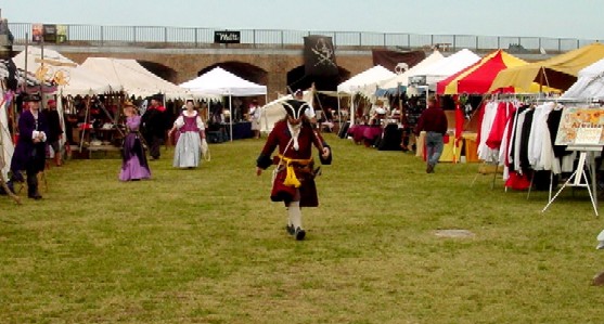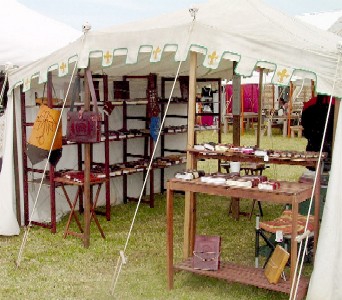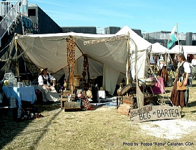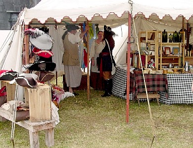 Above left: the ticket booth for obtaining entry into the fort, manned by the Bone Ilsand Buccaneers. Above right is the gateway the BI Buccaneers built for the vent. Below left is Bawdy Be's Beg -n- Barter shop. Below right is the Journal store featuring an assortment of hand-made journals. I got a really cool one with pressed flora in the pages to serve as my surgeon's journal. (Now I just need to come up with something to write in it.)
