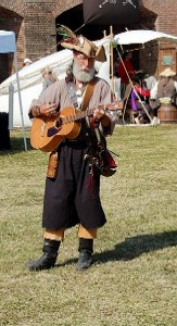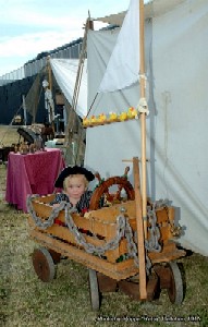 Above left: the Catt and Fiddle, an al fresco dining establishment courtesy of the Pirates of the Coast. That's Hurricane with the guitar and the yellow hat and Diosa at far right in the shot. Above right: the...uh..."sad" candle featured on the table at the C&F. That happened at some event and they kept it because they found it amusing. Below are some captured moments. From left: No Rum Charlie's transport, in the center is what I think looks like a cheap and painful way to get a vasectomy, at right is a wandering fort minstrel.