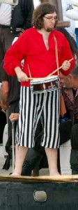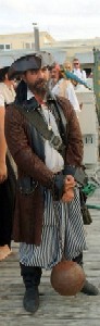 Below we have Captain Spike of the Bone Island Buccaneers dunking. It turns out that Spike was "too nice" to his crew, so they manacled him to a ball and chain to be walked off the plank. Spike appeared to be confused about directions on the plank, so he came back and beseeched the audience to listen to his proof that he was mean and vicious. As proof, he pulled a severed plastic pirate head from his pocket. You'll notice he wound up in the water.