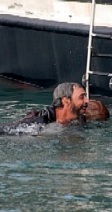 Above we have the saga of the prat from the Discovery Channel. He is trying to win so that he can do some TV show. First he threatened to shoot himself, which I don't see how that can be even remotely effective. Then he rips his parrot in half, which is just odd. Then he nonchalantly goes over the side. (Good riddance, prat.)