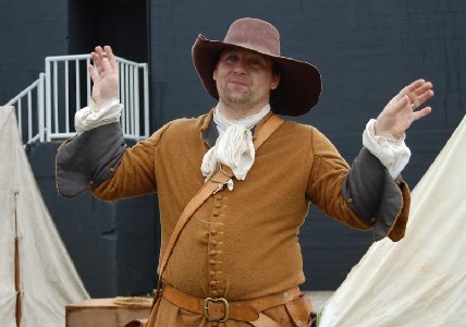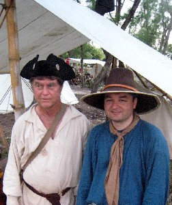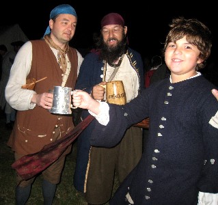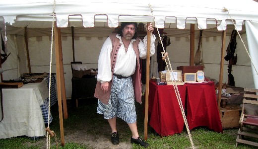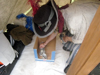 While I was wandering around the fort, I happened across Stynky's tent, where I photographed him carefully tucking away a box (below left). Sensing I had caught the thieving dastard (no, that is not spelled incorrectly - look it up) at his own game, I confronted him. He, of course, being Stynky, tried to sell me the supposed original Mission mug, even though there were several others on hand (below right). No conscience whatsoever. He did at least stop trying to pawn them off on people using Josh, much to Josh's chagrin. Turns out the little stinker had made $60 selling authentic Mission mugs. The lad clearly has a bright future in the used car or insurance industry ahead of him.