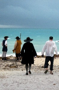 Below left: Edward O'Keefe, Mercury QM William Brand, Archangel Captain Sterling and Mark go to look at the water after the downpour. Below center: Edward said something about a sponge bath that I thought was ill-advised, but who am I to say? Below right: the storm returns, bringing green water with it.