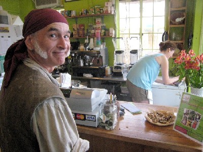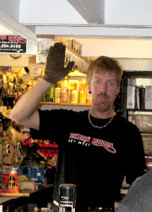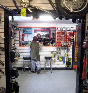 Left: The bike shop holy of holies. Right: the bike shop expert. He's probably in so many vacation albums he's used to this by now.