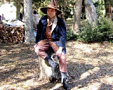 People found all sorts of ways to entertain themselves during the day on Saturday. Above: a charming lass who's name I know not whittling "something" in front of the memorial to Ponce de León. I'd tell you what it was, but when I asked her she hadn't decided yet. Maybe Ponce knew. Below left: Willie Wobble concentrating on some rope work. Center: a gentlemen checks on THE Wench's pack mule. Below right: a bit of fencing practice for James Paul and Michael Browning. Isn't it amazing that I can you the names of people you can't see but I can't tell you the names of people whose faces you can see as clear as day?